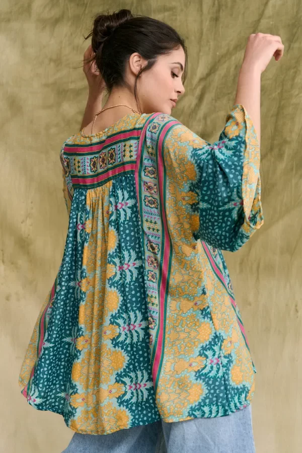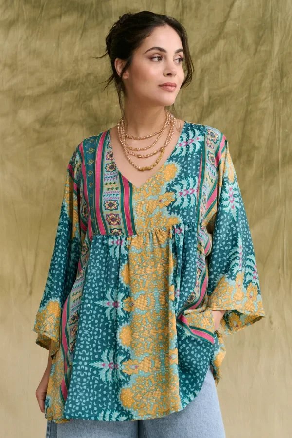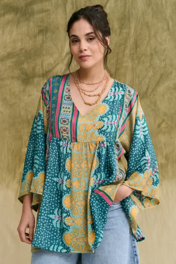 Camisa de mangas 3/4, de moldería amplia y cuello en V. Prenda fabricada con piezas enteras de seda de sari y por su forma de confección, la estampa puede variar entre uno y otro, haciendo que cada una sea única. La prenda viene dentro de una bolsita confeccionada en la misma tela base. Producto fabricado en India. La modelo usa talle S/M.