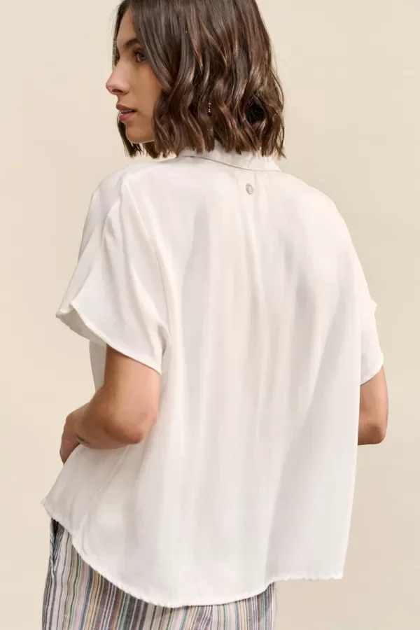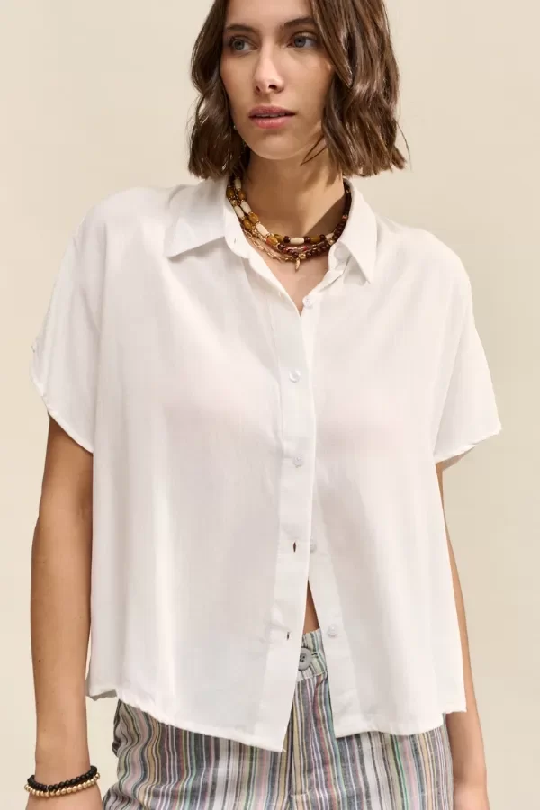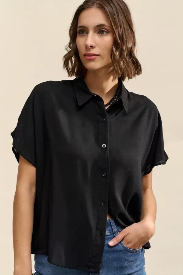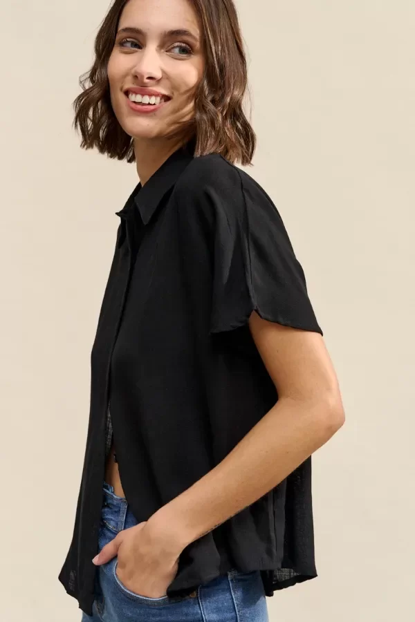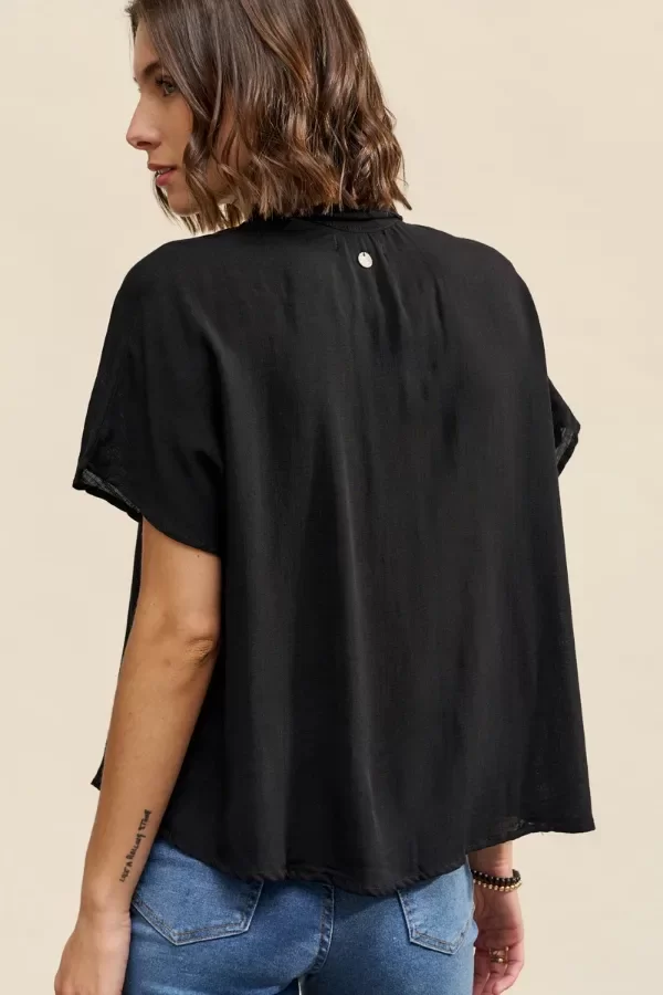 Camisa confeccionada en simil lino. Modelo suelto y corto, abotonado en delantero con mangas caídas. La modelo usa talle s. Las medidas de la prenda en talle S son: Contorno de busto: 104 cm / Contorno de ruedo: 108 cm / Largo total: 62cm