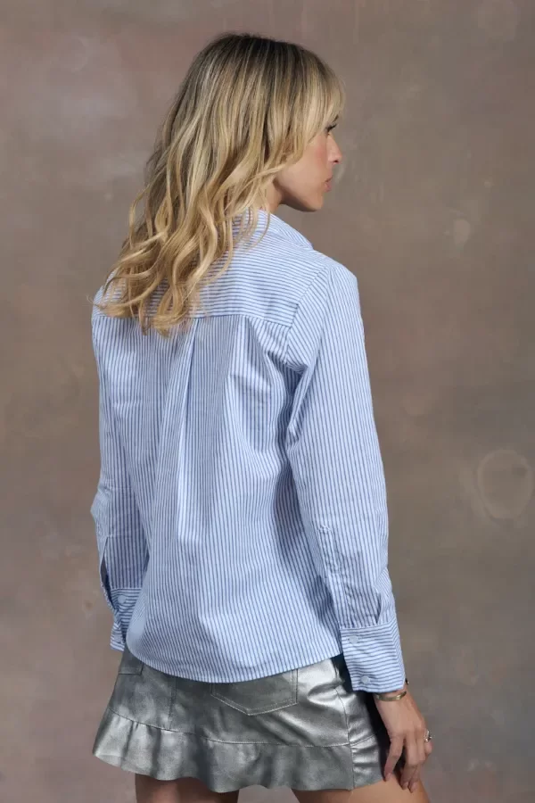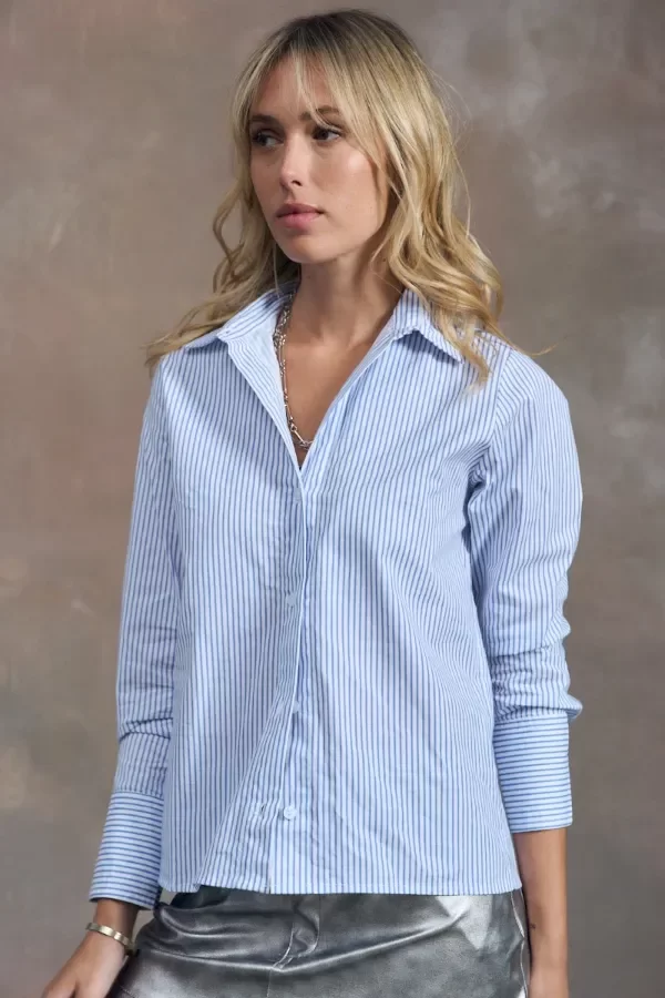 Camisa de manga larga y corte clásico, con botones de pasta al tono de tela base. Confeccionada en poplin liso. Puños anchos, con 3 botones en cada uno. La modelo usa talle Small. Medidas talle S: Largo total: 62 cm / Contorno de busto: 92 cm / Ancho de hombro: 11 cm / Largo de manga: 59 cm.