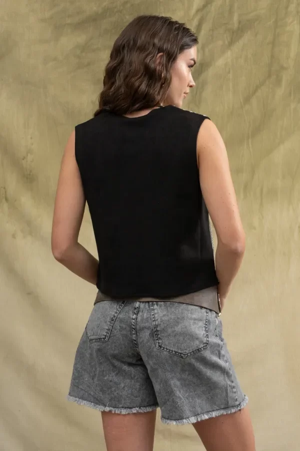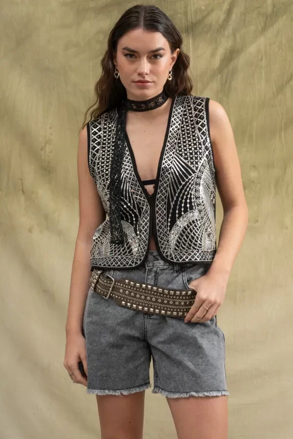 Chaleco gamuzado, completamente bordado en el delantero Posee un ganchito a modo de acceso. La modelo usa talle S. Medidas talle S: Ancho de hombro: 9 cm / Contorno de pecho: 92 cm/ Largo Total: 51 cm