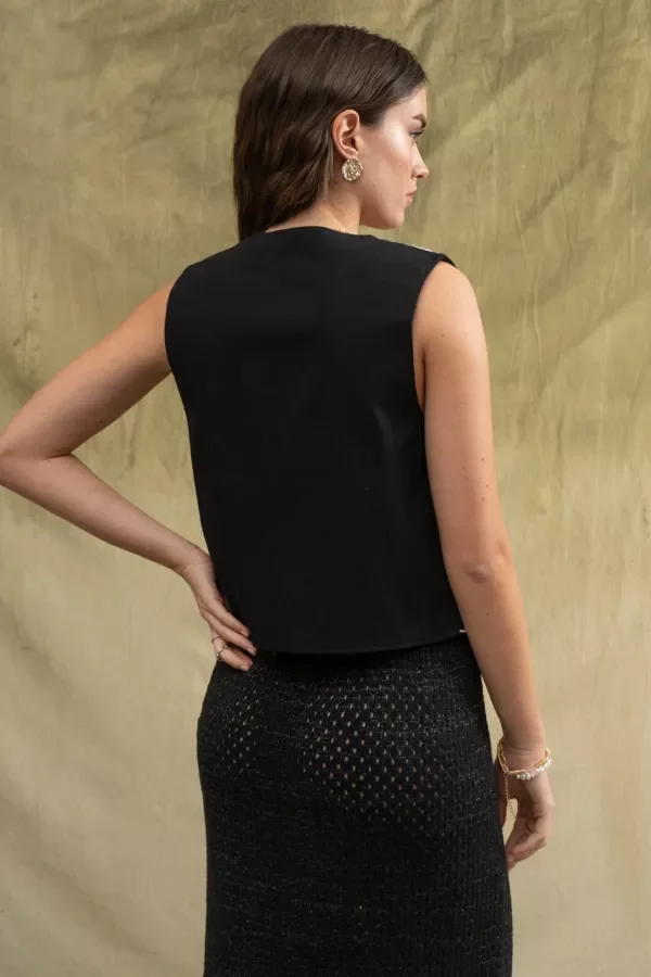 Chaleco confeccionado en sarga de algodón, completamente bordado en el delantero Posee un ganchito a modo de acceso. La modelo usa talle S. Medidas talle S: Ancho de hombro: 9 cm / Contorno de pecho: 92 cm/ Largo Total: 51 cm