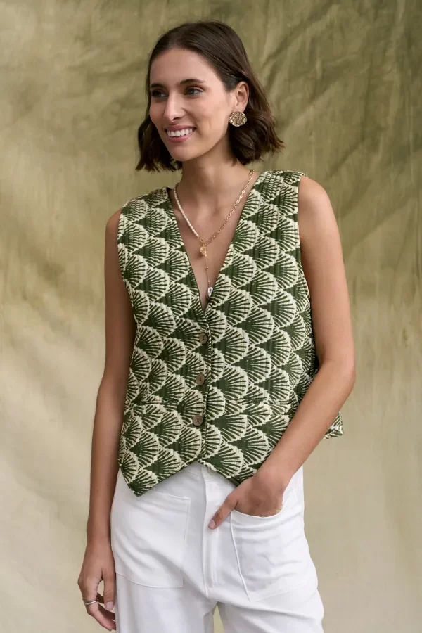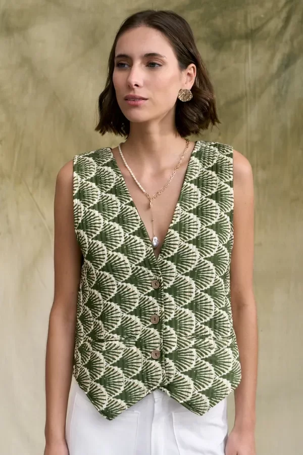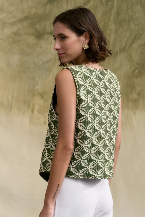 Chaleco confeccionada en seda sari estampado con detalles en dorado propios del genero. 3 botones en delantero para acceder a la prenda. Producto importado de India. La prenda viene dentro de una bolsita confeccionada en la misma misma tela. La modelo usa talle S/M. Las medidas de una prenda talle S/M son: Ancho de hombro: 8 cm / Contorno de pecho: 92 cm/ Largo: 54 cm