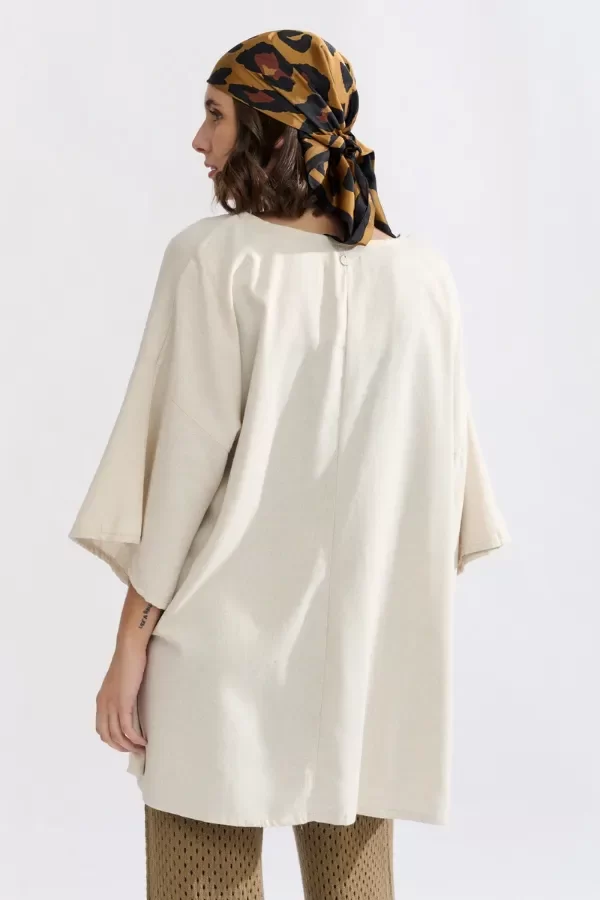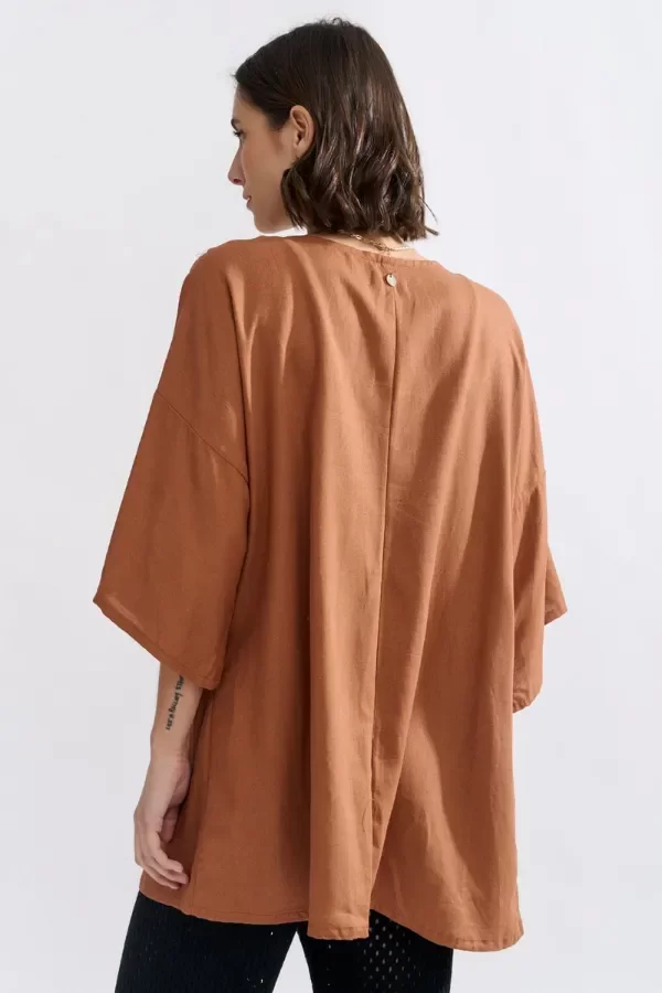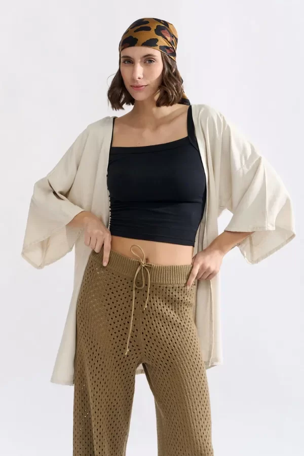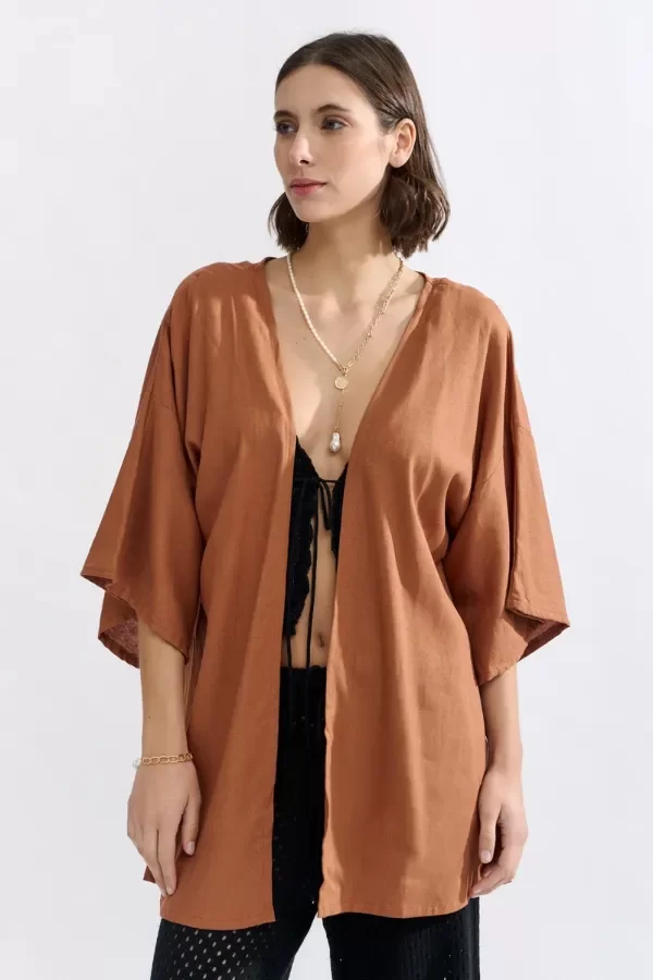 Kimono corto confeccionado en lino liso. Modelo suelto de mangas 3/4 y escote en V. La modelo usa talle Único. Medidas talle U: Largo total: 77 cm / Ancho de hombro + Largo de manga: 45 cm.
