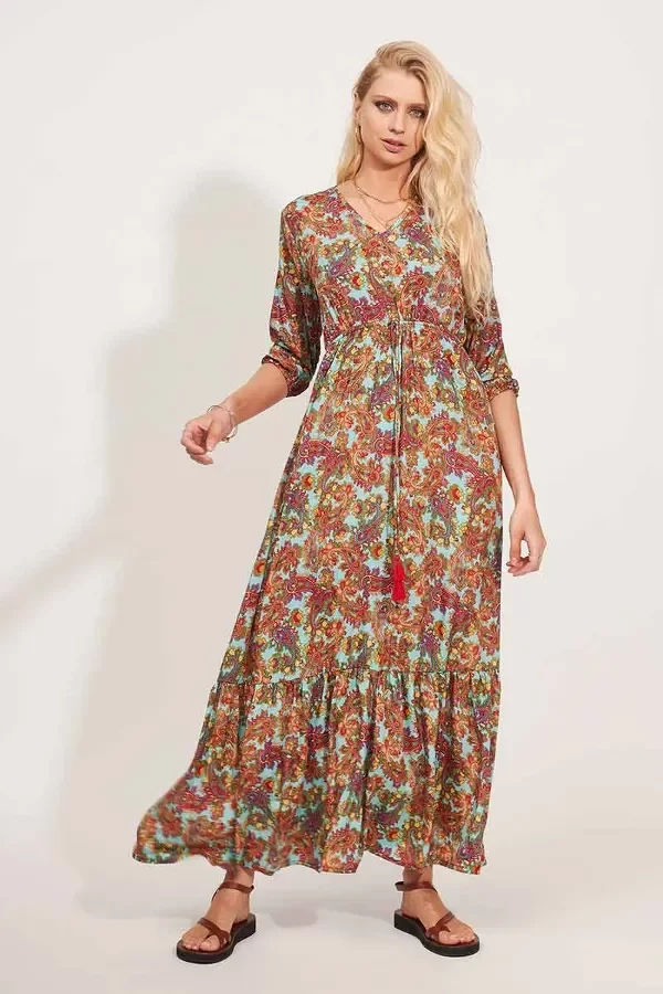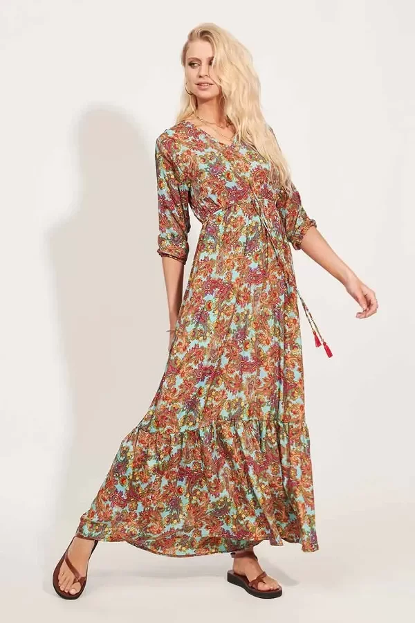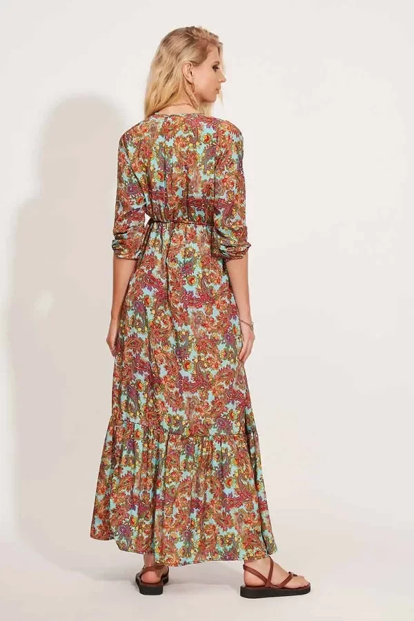 Vestido largo con mangas 3/4 y cuello en V.