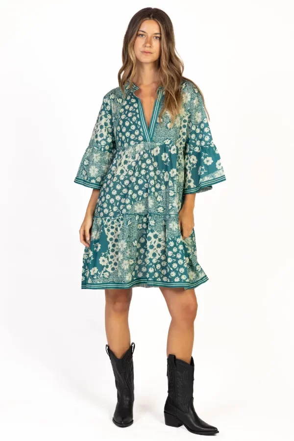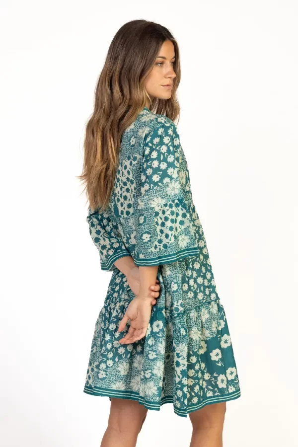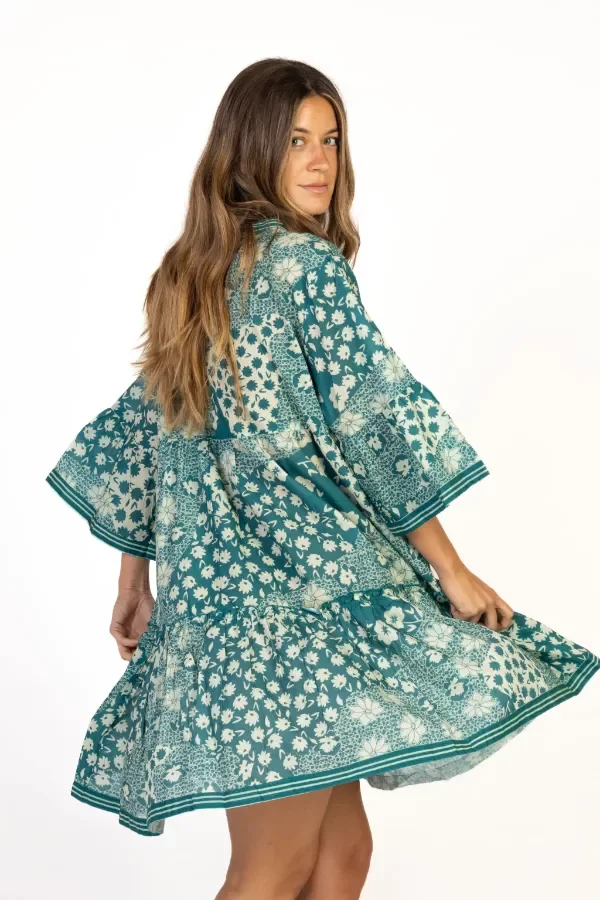 El modelo posee mangas 3/4 con volado para darles terminacion a las mismas, y volado en terminación de ruedo brindandole a la prenda amplitud y vuelo.