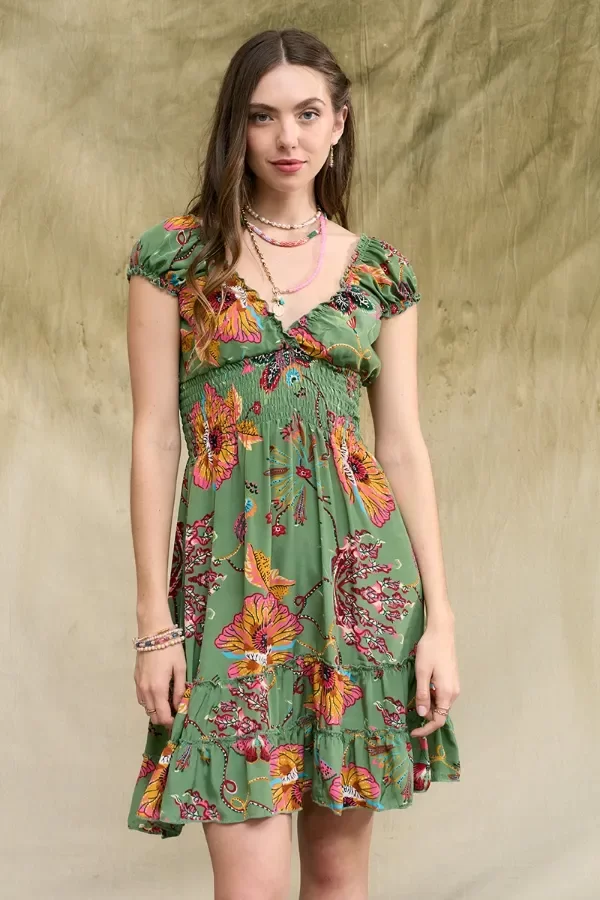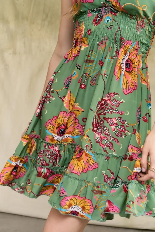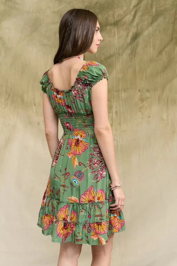 Vestido corto confeccionado en seda Sari. Posee elástico en todo el recorrido de escote y ruedo de mangas. Cintura alta elastizada y frunces en bajo. Modelo de muy buena caída, adaptable a cualquier tipo de cuerpo gracias a su elasticidad en las diferentes zonas del cuerpo. La prenda viene dentro de una bolsita confeccionada en la misma misma seda Sari. La modelo usa talle S/M. Medidas talle S/M: Largo total: 92 cm / Contorno de pecho (sin estirar): 56 cm / Largo de manga: 12 cm