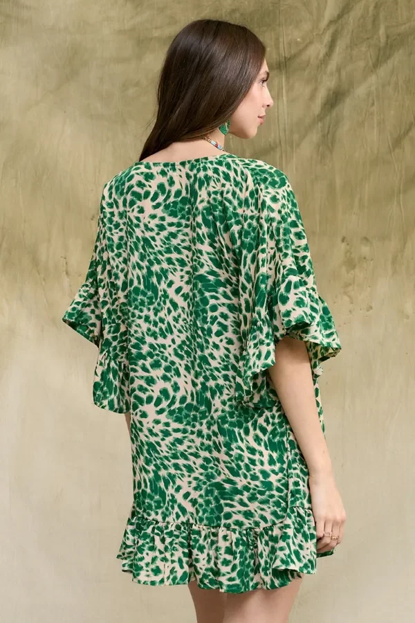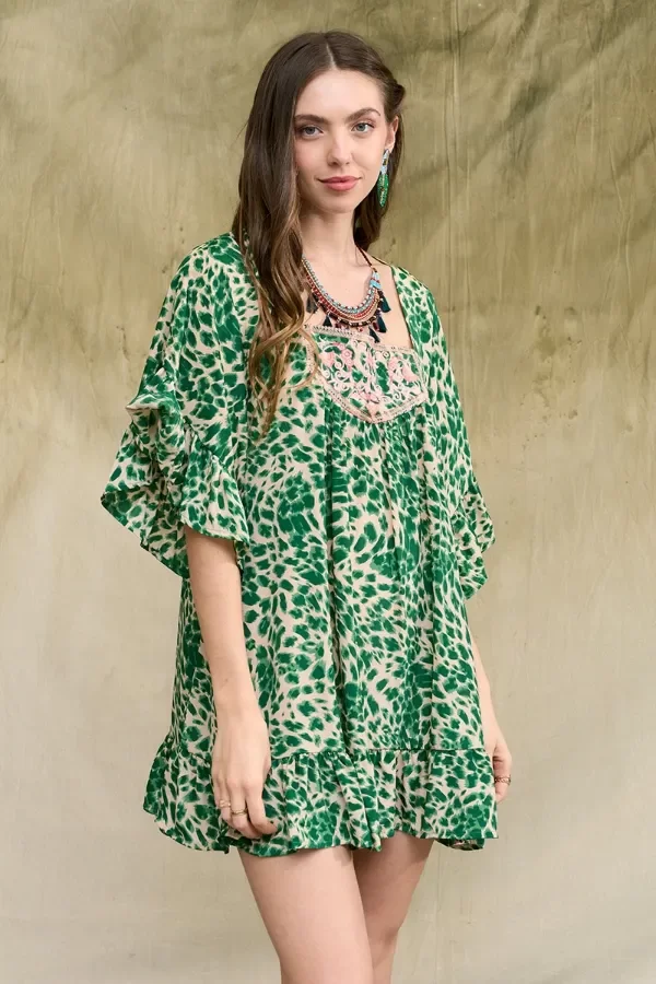Vestido corto confeccionado en seda Sari. Posee escote cuadrado, con detalle de bordado que genera frunce en el delantero de la prenda. Mangas cortas amplias con volado. Modelo suelto y de muy buena caída, con frunce y volado en ruedo. La prenda viene dentro de una bolsita confeccionada en la misma misma seda Sari. La modelo usa talle S/M. Medidas talle S/M: Largo total: 83 cm / Contorno de pecho: 94 cm / Ancho de hombro + Largo de manga: 40 cm