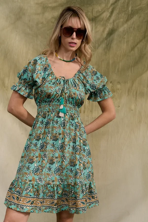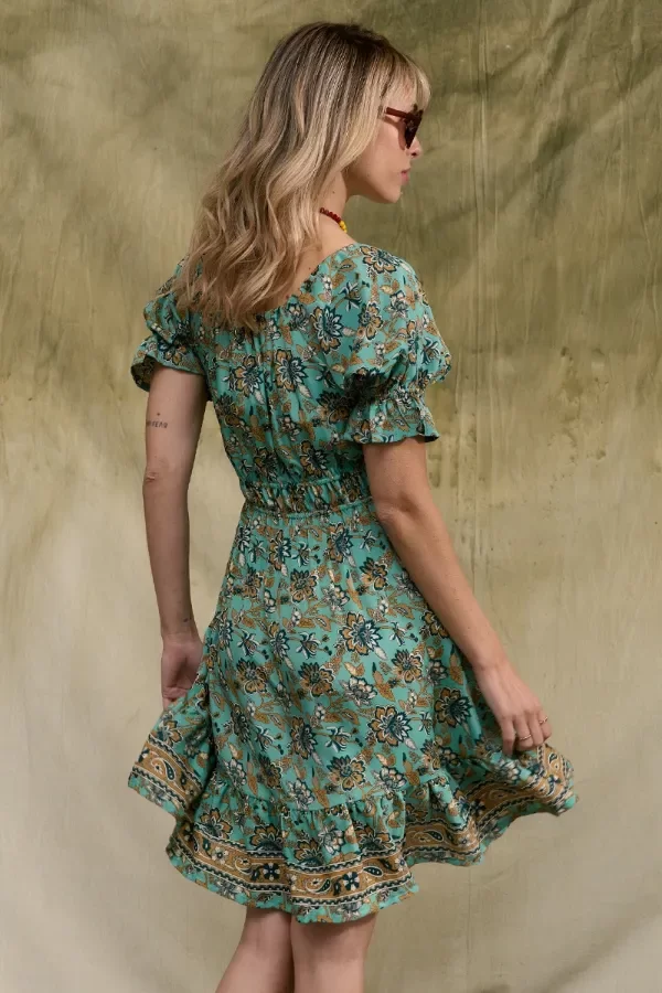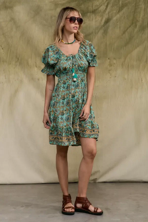 Vestido de seda sari estampada. Posee cuello bote con tiras de ajuste que tienen pompones en sus extremos. La cintura está entallada con elástico. La prenda viene dentro de una bolsita confeccionada en la misma tela base. Prenda confeccionada en la India. La modelo usa talle S/M. El largo de una prenda talle S/M es de 96cm.