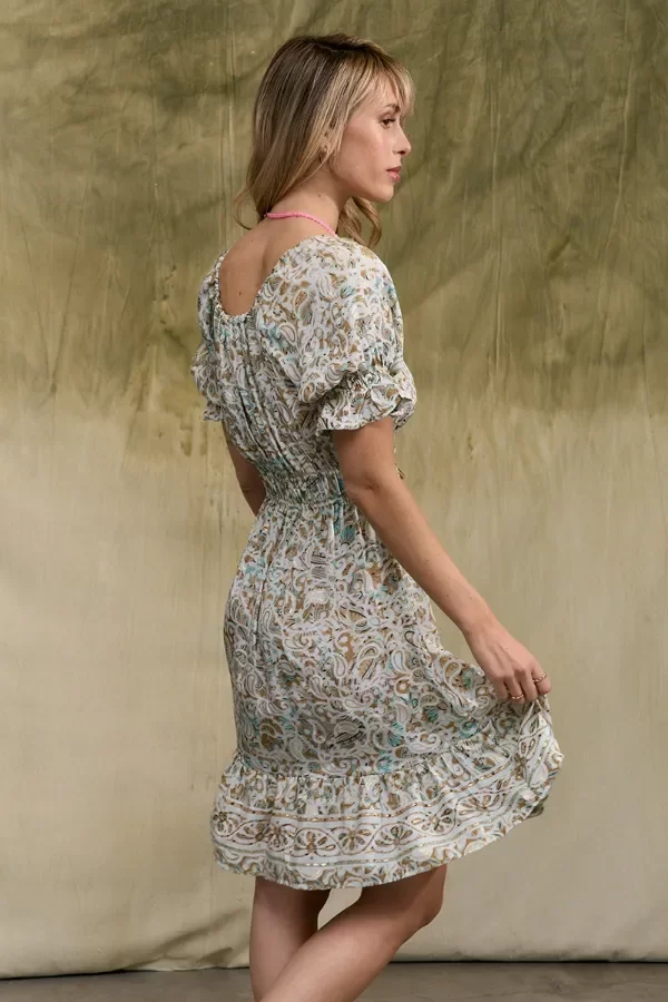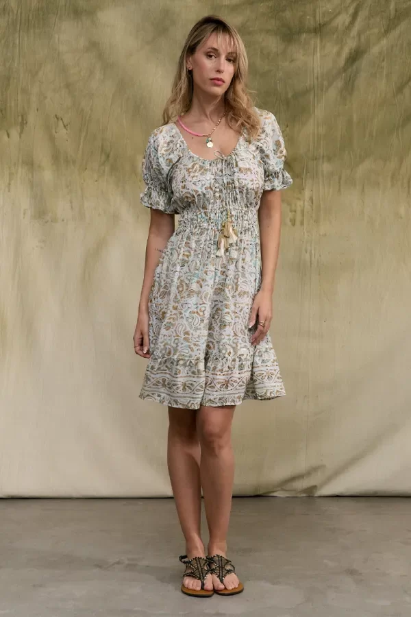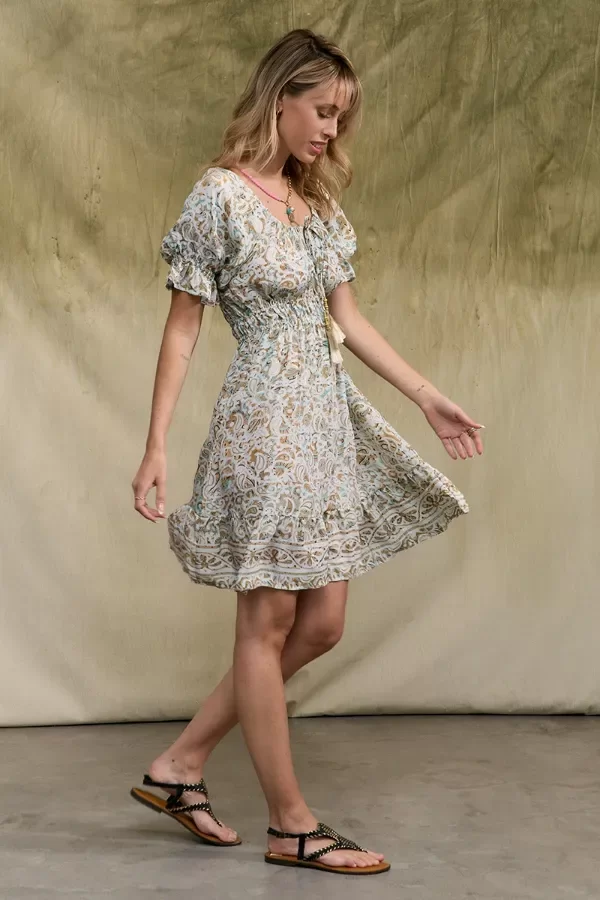Vestido de seda sari estampada con detalles de foil dorado. Posee cuello bote con tiras de ajuste que tienen pompones en sus extremos. La cintura está entallada con elástico. La prenda viene dentro de una bolsita confeccionada en la misma tela base. Prenda confeccionada en la India. La modelo usa talle S/M. El largo de una prenda talle S/M es de 96cm.