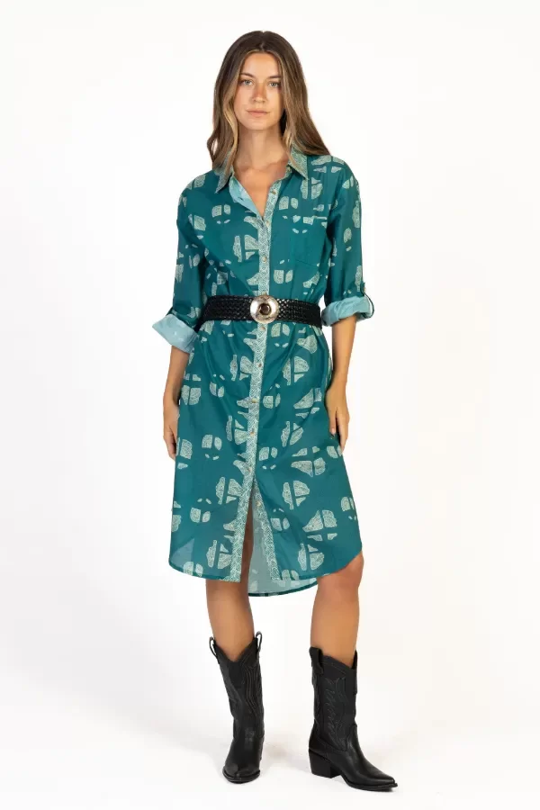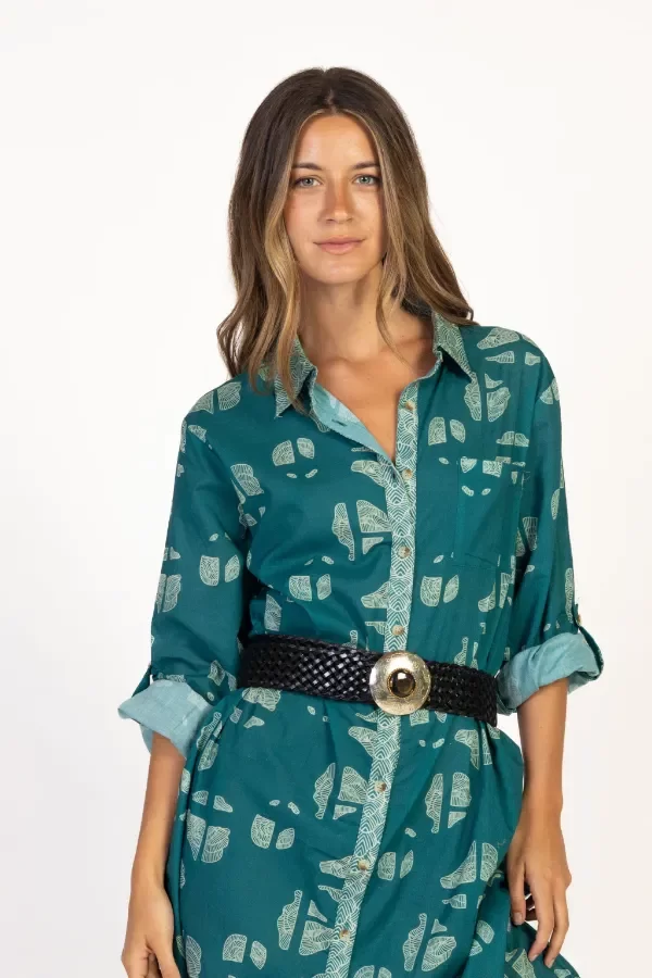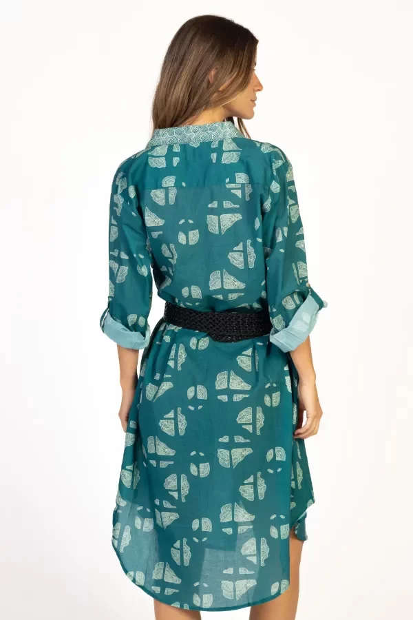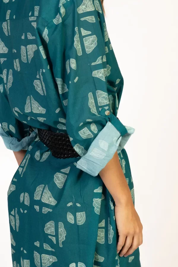 Vestido camisero confeccionado en voile de algodón orgánico, con un estampado artesanal de inspiración natural en tonos verdes y aqua.