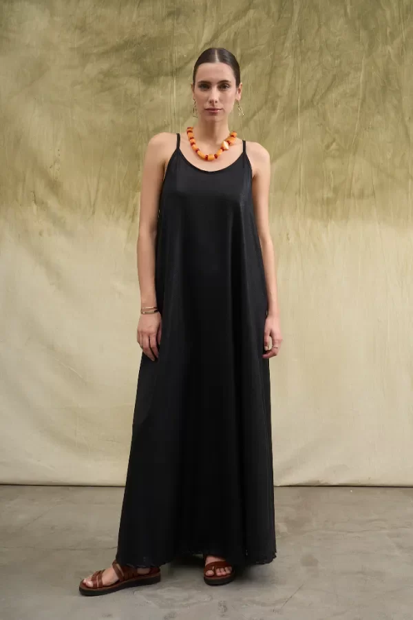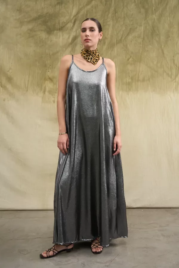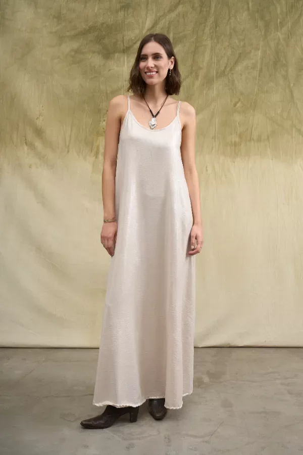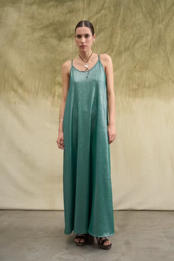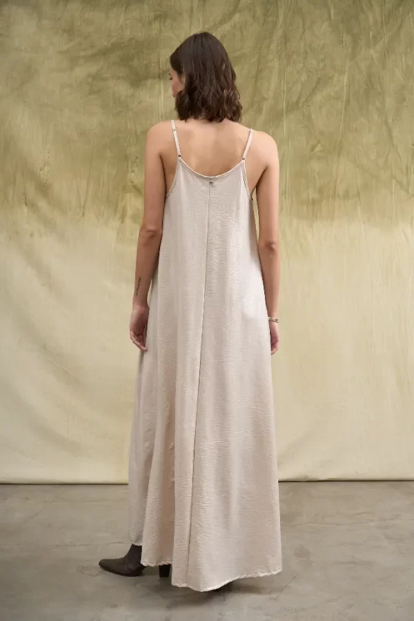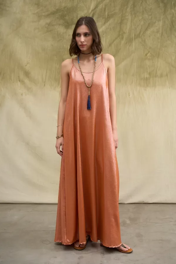 Vestido largo confeccionado en simil creppe brilloso. Los breteles tienen correderas metálicas para regular el largo. La modelo usa talle Small. Medidas talle S: Largo total: 1,45m / contorno de busto: 81cm.