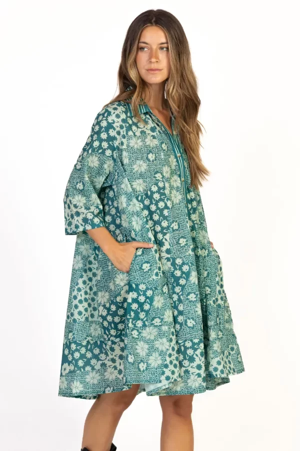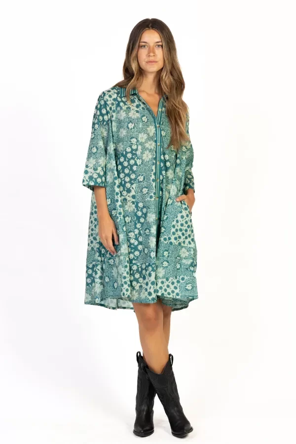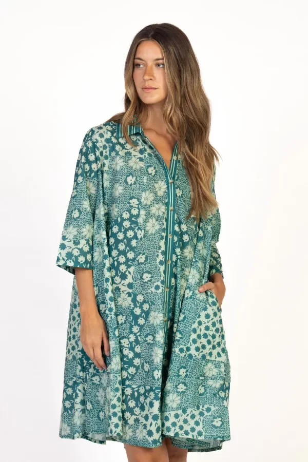 Prenda amplia y liviana confeccionada en voile de algodón, con un estampado artesanal en tonos verde jade y aqua. Su diseño fluido y su calce oversize la hacen cómoda y fresca, ideal para los días cálidos.